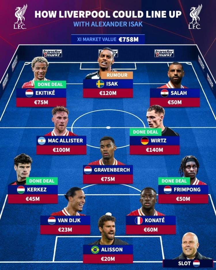 英超大结局?德转预测签伊萨克后的红军主力阵:索博&加克波替补 admin 2025年07月24日 21:30 113 0 直播吧7月24日讯 利物浦刚刚官宣埃基蒂克,而多方消息确认,伊萨克已经告知纽卡希望离队,《转会市场》也据此预测了红军新赛季主力阵容。德转列利物浦新赛季主力阵:总身价7.58亿欧元前锋:埃基蒂克(7500万)、伊萨克(纽卡,1.2亿)、萨拉赫(5000万)中场:麦卡利斯特(1亿)、赫拉芬贝赫(7500万)、维尔茨(1.4亿)后卫:科尔克兹(4500万)、范迪克(2300万)、科纳特(6000万)、弗林蓬(5000万)门将:阿利森(2000万) 标签: #伊萨克 #利物浦 #预测 #索博 #范迪克 #赛季 #纽卡 #& #amp #埃基蒂克 #主力阵